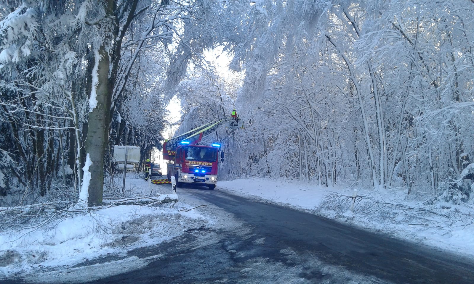 Mit Unterstützung der Drehleiter unserer Stadtfeuerwehr konnten die Bäume abgetragen bzw. abgeschüttelt und somit vom Schnee befreit werden.
