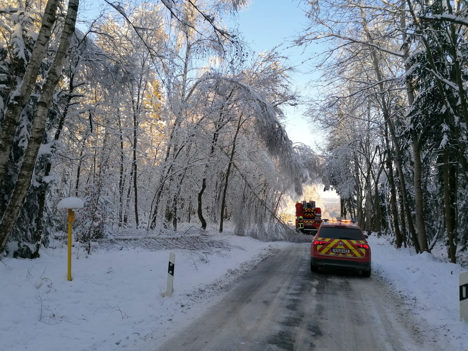 Am Montag früh wurden wir zu einem Schneebruch mit umgestürzten Bäumen auf die K7820 zwischen dem Ortsteil Abhorn und Rodewisch alarmiert.